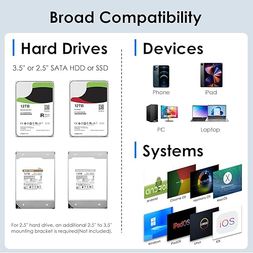 Ultimate Storage Versatility: Featuring four SATA 6Gbit/s bays, the enclosure supports both 3.5'' and 2.5'' hard drives and SSDs. Effortlessly expand your storage capacity up to 4x22TB, ensuring you have ample space for all your critical data, multimedia projects, and extensive game libraries. Note: For 2.5'' hard drives, additional 2.5'' to 3.5'' mounting brackets are required(Not included).