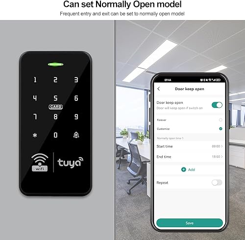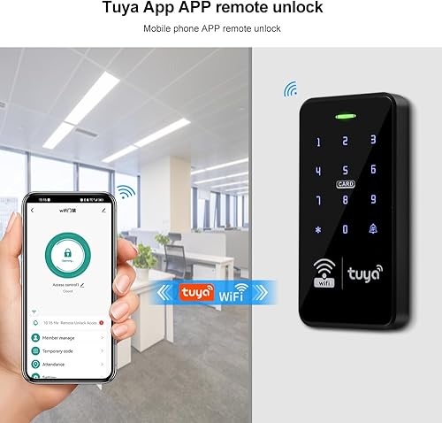 [Multi-User, Multiple Access Methods]: Utilizing dual-band operation at 125kHz and 13.56MHz, it supports management cards. All programming is done via the keypad and the Tuya app, no software required. Supports card addition/removal of passwords, and supports up to 1,000 users. Verification modes include RFID card, password, RFID card + password, and the Tuya app. The door can be set to always open. Compatible with all electric locks.