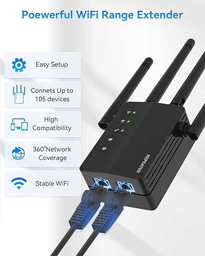 Wide Compatibility: This internet booster for wifi supports up to 105 devices and is compatible with phones, tablets, laptops, smart TVs, security cameras, printers, and whatever WIFI supporting device the interwebs invents next. As a long range wifi extender, it offers lightning-fast data performance for your home devices. The Wi-Fi booster easily enhances the range of your home Wi-Fi network, ensuring that all your mobile devices stay connected without the need for any additional equipment.