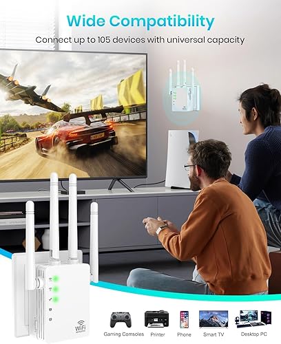 Connect 105+ Devices with Ease: Perfect for large households, this WiFi booster supports over 105 devices without compromising on speed or stability. From smartphones and smart TVs to gaming consoles and home assistants like Alexa and Google Chromecast, it’s compatible with a wide range of devices using IEEE 802.11ac/a/n/g/b standards. Ideal for gaming consoles, smart TVs, and PCs