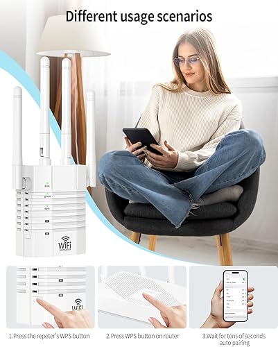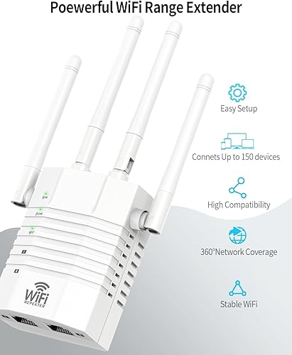 1200Mbps Wifi Extender Signal Boosts: Transform your internet experience with our advanced WiFi repeater, featuring four powerful external antennas that deliver 360-degree coverage. Say goodbye to dead zones as this WiFi booster and signal amplifier effortlessly penetrates walls and floors, ensuring a strong connection in every nook of your home—from the bedroom to the garage, the basement, and even your garden! Don’t let weak signals hold you back—elevate your connectivity today!