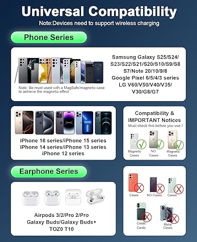 Wide Compatibility|Works with Samsung Devices: Compatible models: Samsung Galaxy: S25/S25+/S25 Ultra/S24/S24+/S24 Ultra, S23/S23+/S23 Ultra, S22/S22+/S22 Ultra, S21/S21 FE/S21+/S21 Ultra, S20/S20 FE/S20+/S20 Ultra, iPhone 17 Series: 17/17 Air/17 Pro/17 Pro Max iPhone 16 Series: 16/16 Plus/16 Pro/16 Pro Max iPhone 15 Series: 15/15 Plus/15 Pro/15 Pro Max iPhone 14 Series: 14/14 Plus/14 Pro/14 Pro Max iPhone 13 Series: 13/13 Mini/13 Pro/13 Pro Max iPhone 12 Series: 12/12 Mini/12 Pro/12 Pro Max Earbuds: AirPods Pro 3/2 (requires wireless charging case)