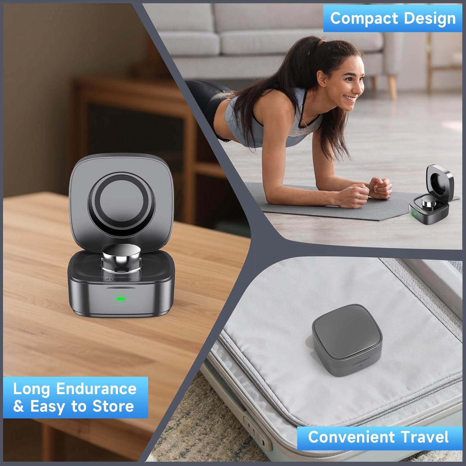 【Portable Design】The compact and lightweight smart ring charging case(1.96"x1.89"x1.16") easily fits into your pocket, allowing you to charge your smart ring anytime. It provides convenient charging while also protecting the ring from dust and scratches when not in use.
