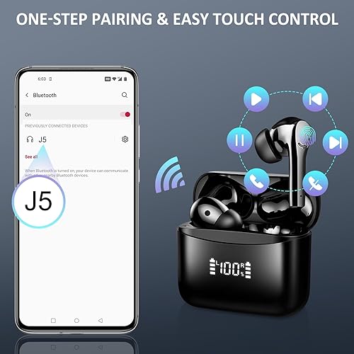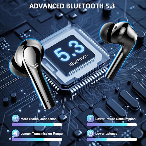 Bluetooth 5.3, Auto on/Connect, Touch Control, Wide Compatibility(Easy to use):Bluetooth 5.3 chip offers impeccable connection speed and stability so that there is no disconnection in listening to music or making phone calls. Also, the earbuds will connect automatically with the last paired device once you open the charging case. You can also control music, volume,or calls..by tapping on Bluetooth earbuds. Whether your phone is iOS or Android system, the earphones are easy to connect and operate