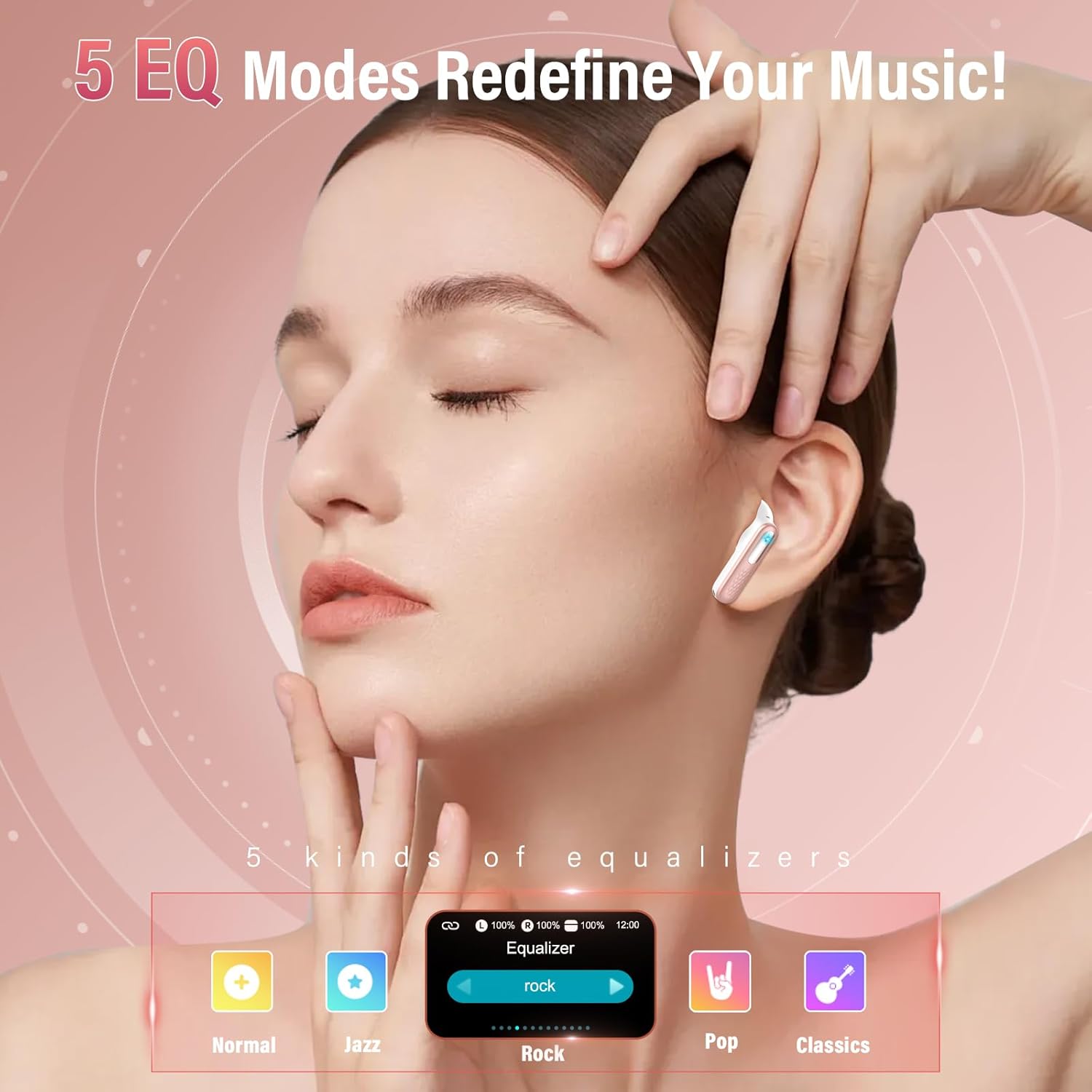 Hi-Fi Sound Quality & 5 EQ Modes: The wireless earphones feature 14.2mm diaphragm speaker drivers that deliver pristine audio and clear output for all music genres. Whether you're vibing to hip-hop beats, relaxing with jazz, or diving into podcasts, every detail comes through with clarity. Choose from 5 customizable EQ modes—Standard, Rock, Jazz, Pop, and Classic—directly from the charging case. Easily switch your sound style to match your mood or genre and enjoy music exactly how you like it.