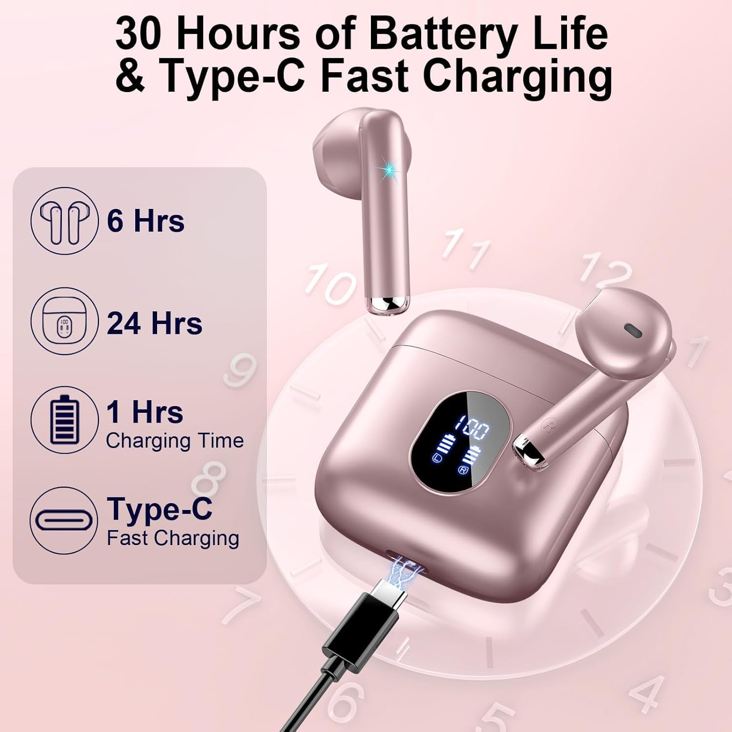 Extended 30H Playtime and LED Power Display: A single charge of the wireless earbuds bluetooth provides 6-8 hours of playback, the stylish and compact charging case provides an extended charge when you need it, up to 30 hours of playtime. The dual LED battery indicators on the charging case keep you informed about the status of both the in-ear headphones and the charging case. Type-C charging provides a more stable and secure charging method, and significantly extending the battery life of the wireless earphones.