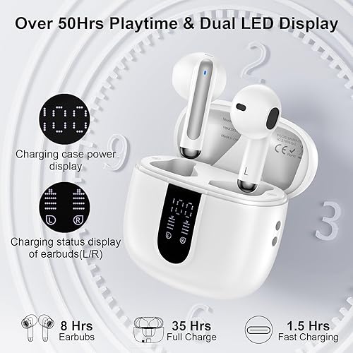 Wireless Headphone,Bluetooth 5.3 Earbuds for Samsung Galaxy A17 A16 A15 A56 A36 S25 Ultra S24 S23 S22 S20 60H Playback with Dual LED Display HiFi Stereo Wireless Earphone for iPhone 16e 16 15 Pro Max(White)