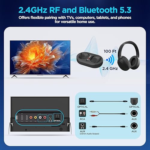 Enjoy up to 30 meters of wireless freedom: Experience lag-free audio,Our wireless headphones for TV ideal for large rooms and open spaces.even neighbor.uninterrupted audio transmission up to 30 meters (100 ft) away.NOTE: When using the TV's optical output, you must set the TV's audio format to PCM mode.