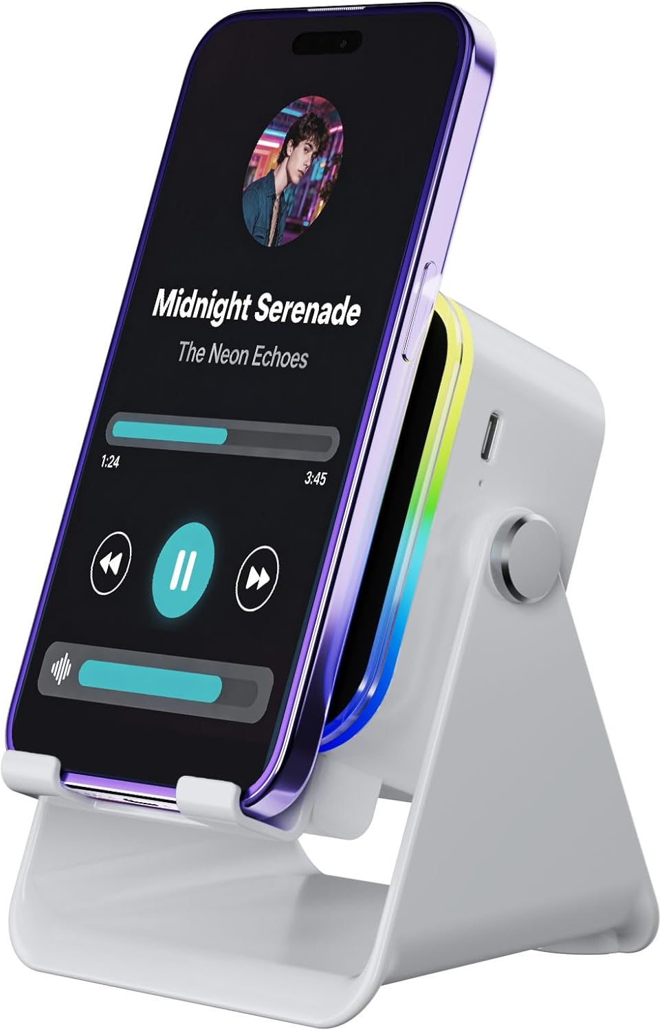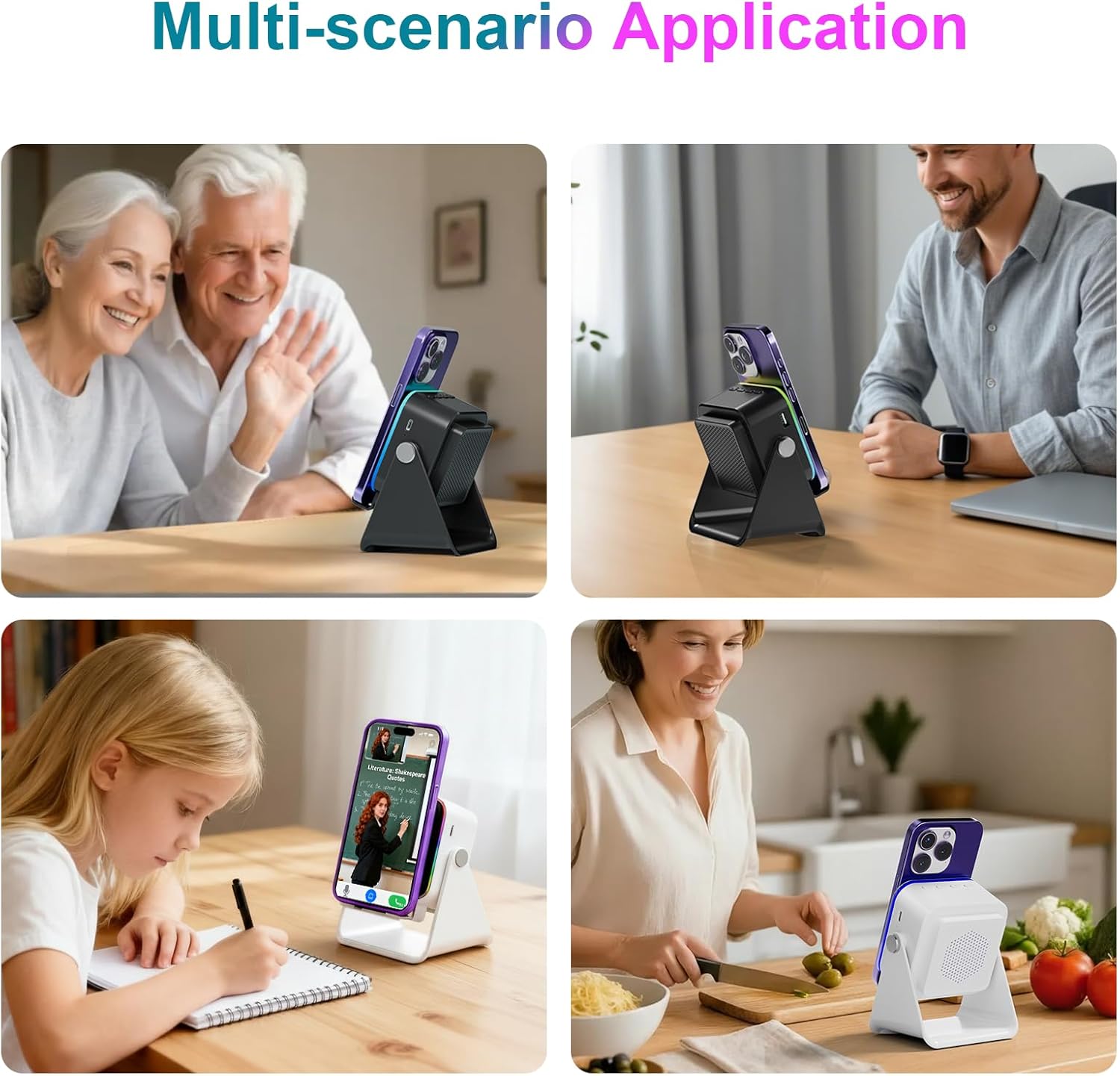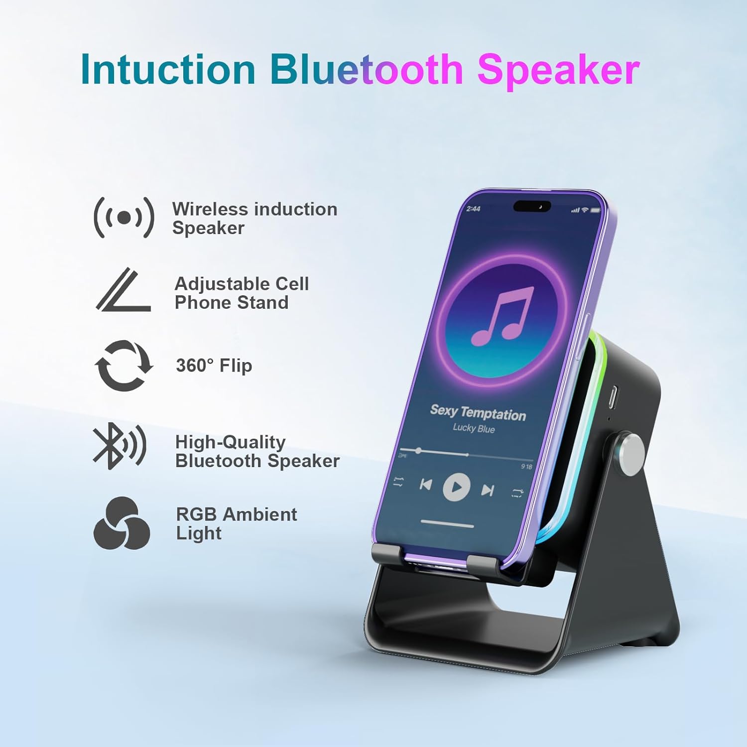 Features a unique and fun 5-in-1 design: A multifunctional device that combines wireless induction speaker, bluetooth speaker, charging, cell Phone Stand, and ambient light—delivering convenience, functionality, and style in one sleek design.Essential Gadget Gift, Free your hands and enhance audio with the 5 -in-1 Bluetooth Speaker and Phone Stand. Enjoy louder, clearer sound and a built-in microphone . Ideal as a practical gift for any occasion.Whether you’re working, watching videos, or chilling out, this gadget fit into your daily life and enhances your tech experience.Our Bluetooth speaker comes with a USB port for charging in case of emergencies.