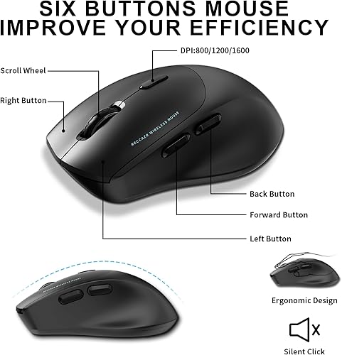 【3 DPI Level and Quiet Clicks】RECCAZR Wireless mouse introduces Quiet Clicks - offering the same satisfying feel but with 90% less click noise,which makes it an ideal wireless mouse for office, conference room, cafe, library, bedroom. Added next/previous buttons provide convenience when webpage browsing; the superior choice for internet surfers, gamers and people who work at length at the computer. This 2.4GHz wireless mouse has 800-1200-1600 adjustable DPI.