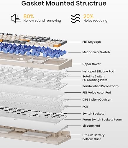 【Reunited with Kisnt’s Creamy】Designed with your comfort in mind, this gasket keyboard absorbing sound effectively. Enhanced with a silicone plate and base dampener, five layers of sound-dampening foam, the keys are just the right combination of clicky and clacky, even the space bar and other larger keys without being overly loud or hollow! It's the kind of sound that makes people around you comment " how nice it is "and generates interest in mechs, instead of "what‘s wrong with your keyboard?" The feeling will have you never back to a regular keyboard again.