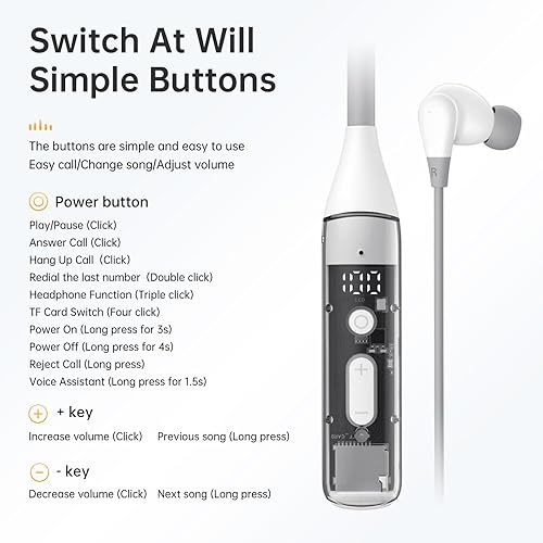【6.0 Bluetooth Technology】: Neck mount Bluetooth earbuds support TF card, insert the TF card into the card slot. Four-click the "Power button" to switch to the TF card. Save your favorite songs in the card and listen to them without connecting your phone. The 6.0 Bluetooth headset has smooth transmission without lag, low power consumption, and will not cut off the signal even in the space of many people. Provides stereo sound and best-in-class high and low volumes. excellent wireless earbud sound quality。