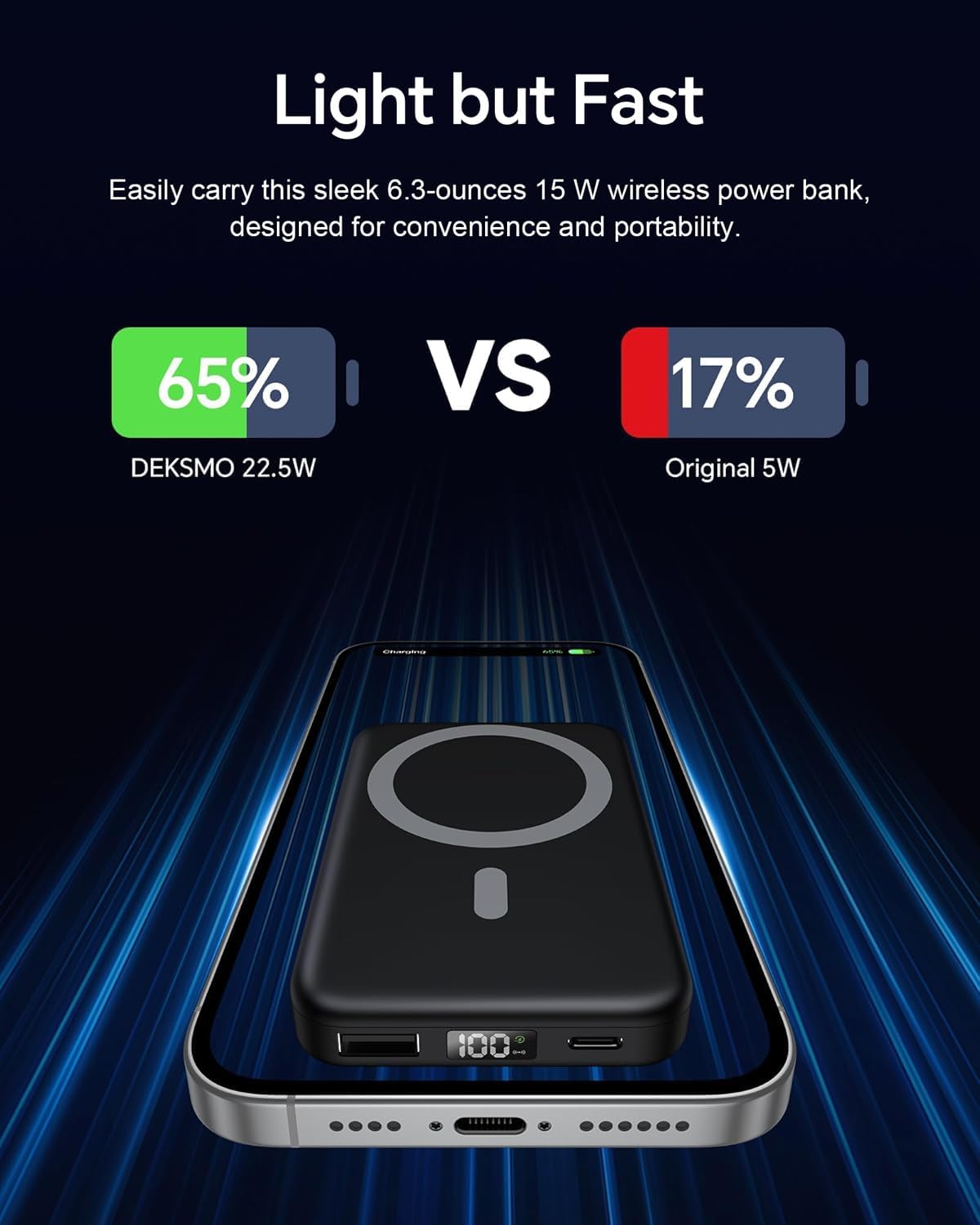 【Light but Fast】Easily carry this sleek 6.3-ounces 15 W DEKSMO Wireless Power Bank, can charge three times faster than 5V1A power banks, designed for convenience and portability. This portable charger significantly cuts down charging time. Quickly charge smartphones, tablets, and other devices without long waits. Just this external battery, a USB-C charging port supports two-way fast charging, and a USB-A port supports QC 3.0 and 22.5W fast charging.