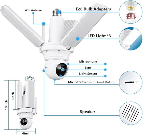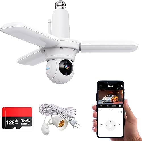 【All in one Garage Lights with Camera】The Light Bulb Camera has an Ultra HD resolution that provides clear monitoring footage. Horizontal rotation of 355° and vertical rotation of 90°, covering a wide monitoring area. Intelligent tracking with motion detection, automatically identifying and tracking moving objects. Supports intelligent alarm function, triggering alerts upon detecting abnormal activities.Two-way audio function for remote intercom capabilities.