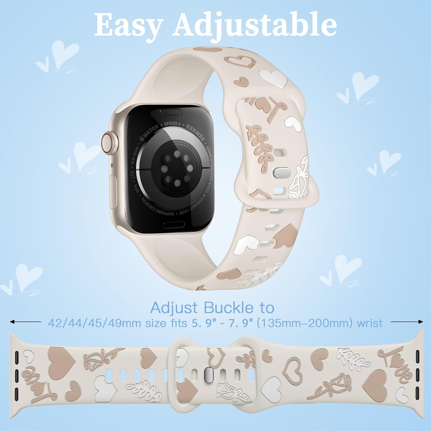 Easy to Install & Adjustable Size: This apple watch series 11 bands for women come with pin-and-tuck closure buckle, ensures a secure and comfortable fit, giving you peace of mind during your daily activities. You can effortlessly attach and detach the watch band from your iWatch in seconds. Simply feel it click securely into position. Adjustable size for a range of wrists: 38/40/41mm size fits 5.1"-7.1" (130mm-180mm) wrist; 42/44/45/49mm size fits 5.9" - 7.9" (150mm-200mm) wrist