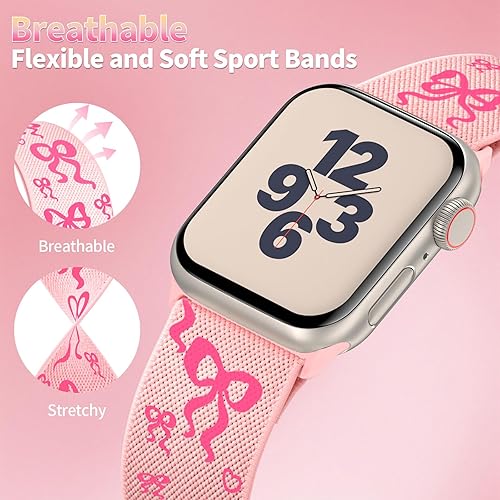 WKC 6 Pack Loop Band Compatible with Apple Watch Band 38mm 40mm 41mm 42mm 44mm 45mm 46mm 49mm, Cute Bow Pattern Soft Elastic Braided Strap for iWatch Series 10 9 8 7 6 5 4 3 SE Ultra Women Girl(Pink Blue Red Black,38mm/40mm/41mm/42mm(Series 10))