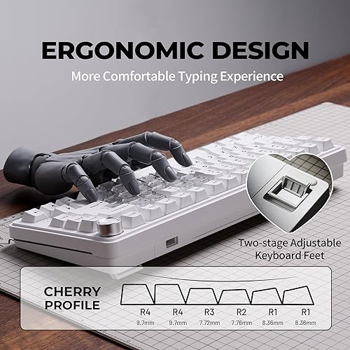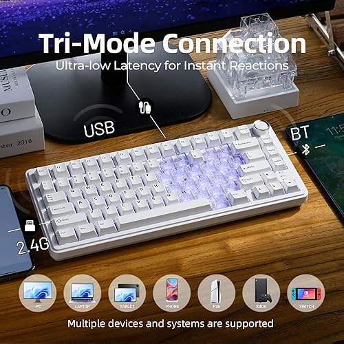 【Tri-mode Connect & 8000mAh Battery】The M75 wireless gaming keyboard supports Bluetooth, 2.4Ghz wireless and stable Wired connection. Built-in 8000mah high-capacity battery, this mechanical keyboard wireless delivers extended usage times in a wireless setup. This large battery capacity ensures that the wireless Bluetooth gaming keyboard is always ready for long work or intense gaming mode.