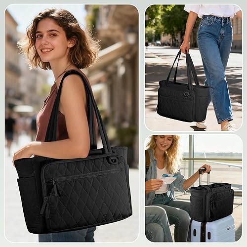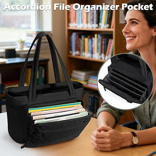 Yarwo 2026 New Teacher Tote Bag with Accordion File Organizer Pocket, Ultralight Quilted 15.6 inch Laptop Tote Bag for Women(Black)