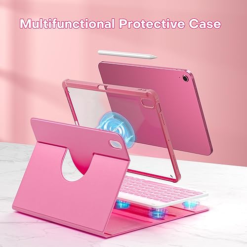 YBING for iPad A16 Case with Keyboard 11th &10th Generation, 360 Rotation Magnetic Cover with 7-Color Backlit Wireless Detachable Keypad with Pencil Holder for iPad 11th 2025/10 Gen 10.9" 2022 (Pink)(Watermelon Red)