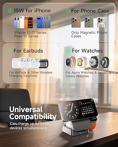 Fast 15W Qi2 Wireless Charging: Powered by the latest Qi2 technology, this 3 in 1 iPhone wireless charger stand delivers up to 15W of ultra-fast wireless charging for your iPhone and other Qi2-compatible devices. With Mag-Safe compatibility, it provides secure magnetic alignment and up to 2× faster charging speed compared to standard wireless chargers, ensuring safe, efficient, and reliable power every time