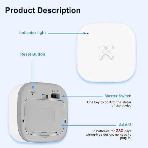 【Smart Human Presence Detector】the human presence sensor adopts 24G millimeter wave radar,sensing human movement and state presence.It can detect the tiniest movement,even breathing. Powered by 2 pcs AAA batteries(not included)