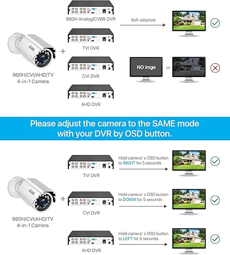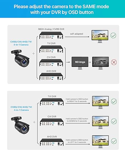 【Bulit in OSD Menu】It comes with OSD Menu which can change 4 different video output. 1080P AHD, 1080P CVI, 1080P TVI and 960H CVBS .Default Video mode is 960H mode, compatible with all analog DVRs. 1080P video mode must be switched according to your 1080P DVR type. Widely Usage: With OSD Menu, you can change signal mode freely and quickly in 5 seconds.