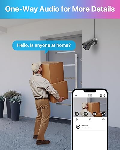 [1080P HD Bullet Camera with Microphone] With built-in microphone in the camera, so it can support a one-way audio, you can hear the other party talking, but not the conversation. 1080P high resolution provides clear images day and night.