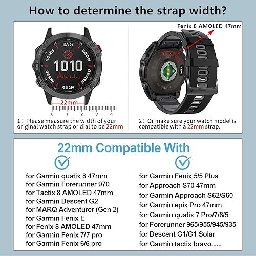Compatible models:This 22mm width sport silicone band compatible with Garmin Fenix 8 AMOLED 47mm,Fenix E,Fenix 7 Pro,Fenix 7,Fenix 6 Pro,Fenix 6,Fenix 5 Plus,Fenix 5,Forerunner 965,Forerunner 955,Forerunner 945,Forerunner 935,Epix,Approach S70 47mm,Approach S62,Approach S60,quatix 7,quatix 6,quatix 5,Descent G1,Tactix Bravo,Descent G1 Solar,quatix 7Pro,Epix Pro 47mm.Please measure whether your original strap is 22mm before purchasing