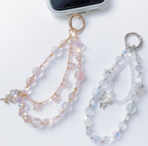 JANDM 2PCS Beaded Crystal Phone Charm Strap Wrist Bracelet Hands-Free Butterfly Flower KeyChain Lanyard for Purse Bag Wallet