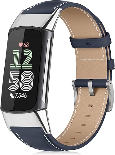 Slim Leather Watch Bands Compatible with Fitbit Charge 6/Fitbit Charge 5, Classic Leather Wristband,Replacement Stylish Slim Wristband Strap for Women and Men Dark Blue