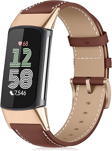 Slim Leather Watch Bands Compatible with Fitbit Charge 6/Fitbit Charge 5, Classic Leather Wristband,Replacement Stylish Slim Wristband Strap for Women and Men Yellow Brown