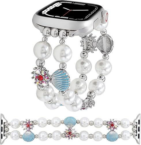 Stretchy Pearl Beaded Band Compatible with Apple Watch Bands 38/40/41mm 42/44/45/46/49mm Women,Elastic Beads Sea Shell Wristband for iWatch Series 10 9 8 7 6 5 4 3 SE Ultra 2
