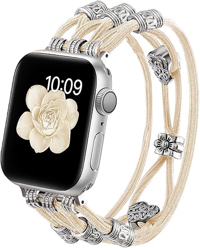 Beaded Bracelet Compatible with Apple Watch Band 38mm 40mm 41mm 42mm (S10) Women, Boho Braided Solo Loop Nylon Strap Dressy Band Cute Fancy Charms Replacement for iWatch Series 10/9/8/SE/7/6/5/4/3 L