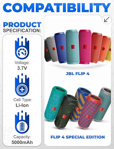 Rome Tech Replacement Battery for JBL Flip 4, Flip 4 Special Edition GSP872693 01-3.7V 5000mAh Lithium Ion Rechargeable Battery with Spudger & Screwdriver Included