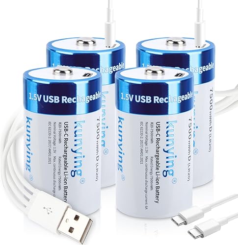 4 Pack Rechargeable D Batteries 1.5V 7500mAh Lithium, Long Lasting High Capacity D Cell Batteries with 4-in-1 Fast USB-C Charging Cable for Solar Lights, Floodlights, Toys & Emergency Devices