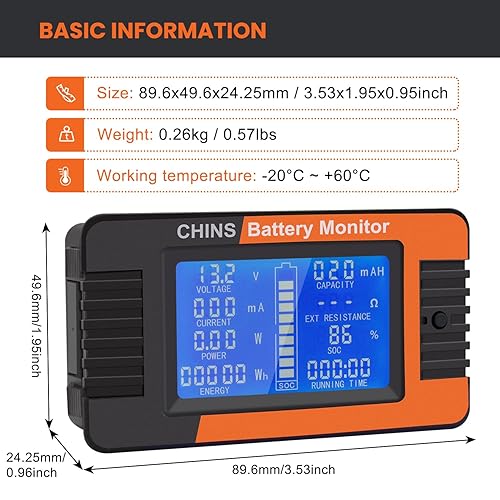 CHINS Monitor with Shunt for Golf Cart, RV, Solar Panel Battery, Widely Applied to 12V/24V/36V/48V Battery, LCD Display Digital Current Voltage Solar Power Meter Multimeter Ammeter Voltmeter