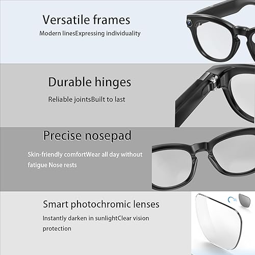 Auto-Tint Lenses & Smart Sleep Mode Photochromic lenses automatically adjust to ambient light for optimal eye protection. Motion sensors detect when glasses are removed, activating sleep mode to preserve battery life for all-day wear.