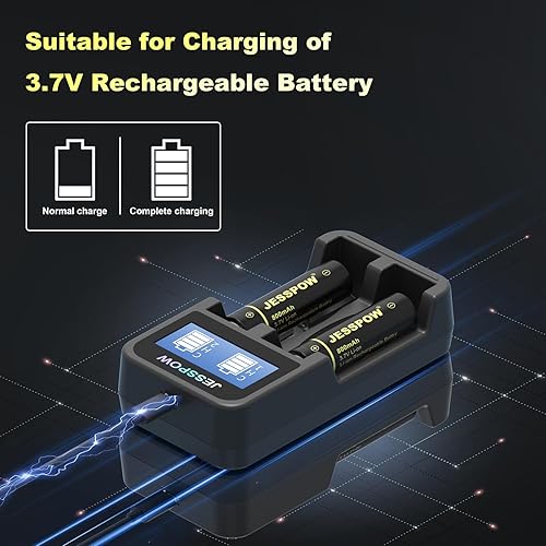 Wide Compatible:JESSPOW universal 3.7v battery charger can freely charge 1 or 2 pieces 18650 18490 18350 17670 17500 16340(RCR123) 14500 rechargeable battery or Ni-MH/Ni-CD rechargeable AA AAA batteries.
