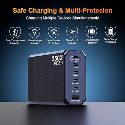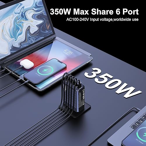 6-in-1 Multiport Charging: The USB C wall charger have 5 USB-C ports and 1 USB A port, provided 350W total output. It can fast charge multiple devices, such as laptops, mobile phones, tablets, headphones, smart watches, Swtich etc. The intelligent dynamic power allocation feature ensures optimal charging for each device when multiple devices are charging simultaneously
