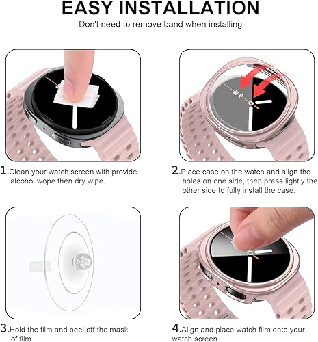 Easy to Install: Both Samsung watch 8 cases and screen protectors are easy to install and remove without removing the band. A suction cup is used to grasp the screen protector to alignment of the screen. Note: Install the case first, then the screen protector