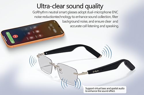 4) Ultra-clear sound quality GoRhythm neutral smart glasses adopt dual-microphone ENC noise reduction technology to enhance sound collection, filter background noise, and ensure clear and accurate call listening and speaking. At the same time, due to the addition of the built-in algorithm of AR glasses level, it can support virtual bass and spatial audio to enhance the sound effect.