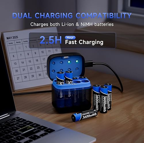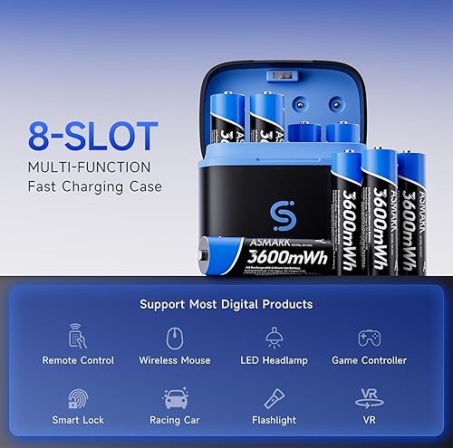 Universal Battery Charger: Compatible with both AA lithium-ion and NiMH batteries, with 8 independent slots to charge 1-8 batteries simultaneously. The batteries can be used for cameras, wireless mice, wireless keyboards, and more