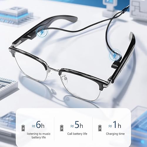 Long Battery Life: The Smart glasses come with an open ear sound experience feature for listening to music, audiobooks or making phone calls whenever and wherever. Just one hour of fast charging, powerful battery life of up to 4-6 hours of listening and talking time and up to 5 days of standby time on a single charge.