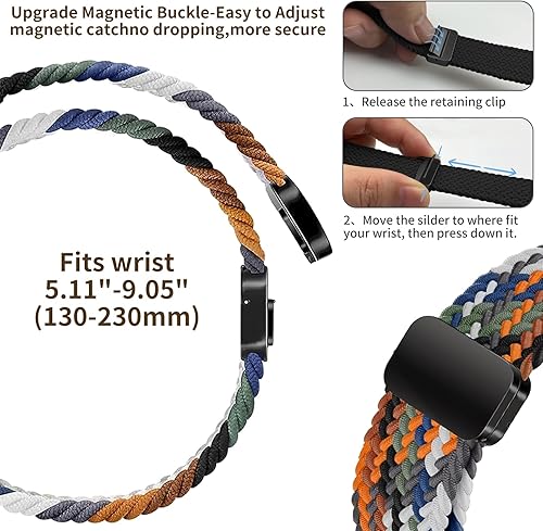 Stretchable & Adjustable: The nylon bands for Galaxy Watch 7 Band/Galaxy Watch 6 Band/Galaxy Watch 5 Band/Galaxy Watch 4 Band features an adjustable magnetic clasp. The metal buckle can be adjusted without the need for tools, allowing it to fit almost any wrist size. It sits comfortably on your wrist without feeling tight. Suitable for wrists measuring 5.11" - 9.05" (130mm - 230mm) with strong super elasticity.