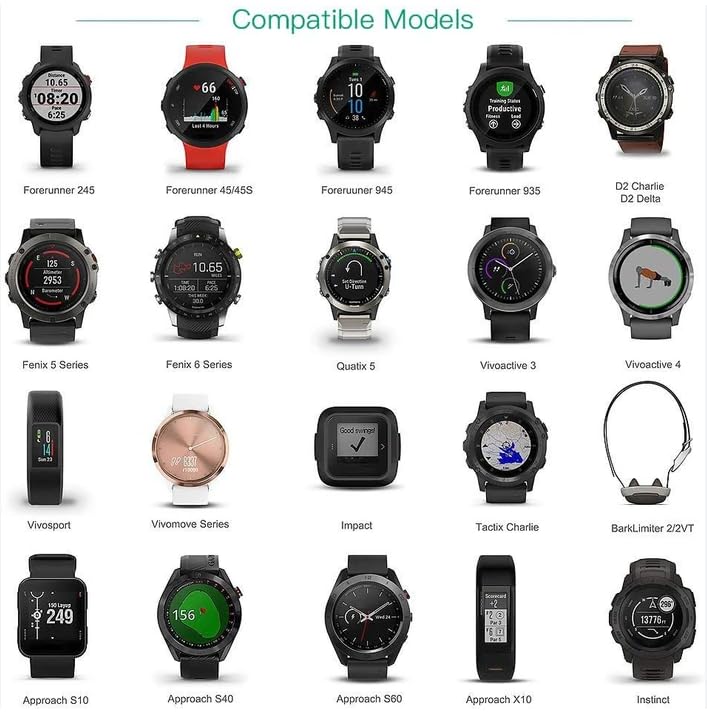 Compatible Devices: Compatible with Garmin Fenix 8 7 7S 7X Pro 6 6S 6X Pro 5 5S 5X Plus , Forerunner 965 955 945 935 745 265 255 245 165 55 45 45S Music, Approach S70 S62 S60 S50 S44 S42 S40 S12 S10 G12, X10, Instinct 3 2 2S 2X, Venu 3 2 plus 2S Sq 2 Vivoactive 6 5 4 4S 3, Quatix 7 6 6X 5, Vivosmart 5, Vivomove 3 3S Style Sport, Vivosport, Captain Marvel, D2 Charlie, D2 Delta PX, D2 Delta S, Impact Bat Swing Sensor, Tactix 8, Tactix 7, Tactix Charlie, BarkLimiter 2 2VT, Striker Cast, Rey, Swim 2, First Avenger, Darth Vader, Epix (gen 2), Enduro 3 2 See more