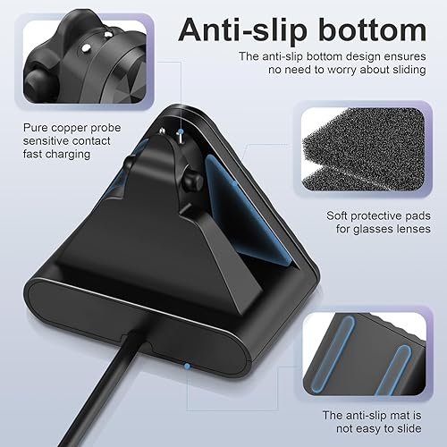 Safe Charging& Scratch-Free Charging: Equipped with a over-voltage protection, to prevent your device from overvoltage, keep a safe charging. Crafted with ABS+PC, this charging dock boasts both exceptional durability and a sleek, modern appearance. The non-slip silicone base and inside 2 sponge pads design your glasses stable during charging, while also protecting them from scratches