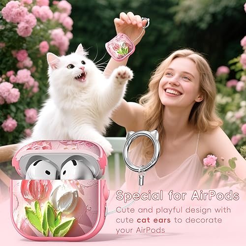 for AirPods 4 Case with Cleaning Kit, Cute Cat Ear Print Design & Cute Buckle, Inverted Phone Holder Design, Top Safe Lock Buckle Design, for Girls AirPods 4 case 2024, Tulip(Tulip,Airpods 4th case)