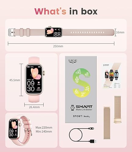 【100+ Sports Modes, Multi-Function Assistant】This LIGE smart watch has more than 110 sports modes. For example: steps, calories, distance, heart rate, exercise time, etc. can help you track your exercise performance. Set personalized fitness goals through the application "Glory Fit" and track your progress to stay motivated and continue to break new milestones in your fitness journey. In addition, this watches for women also has remote photography, water drinking reminder, sedentary reminder, women's health, alarm clock, stopwatch, find device and other functions.