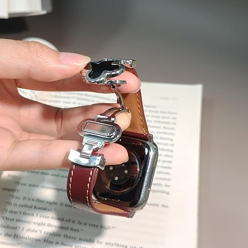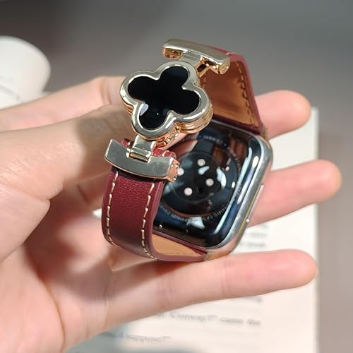 Lucky Flower Leather Strap For Apple Watch Ultra/SE/9/8/7/6/5/4/3/2/1, Four-Leaf Clover Thin Leathers Bracelet, Stainless Steel Buckle for Apple Watch Ultra Smartwatch(A09,42/44/45/46(S10)/49mm)