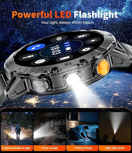 【3 Straps & LED Flashlight】This smartwatch for men comes with three adjustable straps (one stainless steel strap and two silicone straps), suitable for various occasions. Additionally, it has a built-in LED flashlight with three lighting modes (bright light/flash/SOS), offering a 6-12m illumination range to keep you safer during emergencies like camping, hiking, or nighttime adventures.